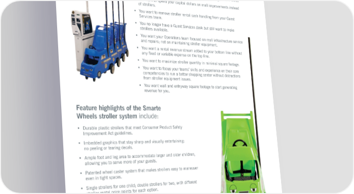 Feature highlights of the Smarte Wheels stroller system include: • Durable plastic strollers that meet Consumer Product Safety Improvement Act guidelines. • Imbedded graphics that stay sharp and visually entertaining; no peeling or tearing decals. • Ample foot and leg area to accommodate larger and older children, allowing you to serve more of your guests. • Patented wheel caster system that makes strollers easy to maneuver even in tight spaces. • Single strollers for one child; double strollers for two, with different stroller rental price points for each option. • Return rewards provided automatically to guests who return strollers to the vending track after use. • Anti-theft poles to deter inventory loss. • Rugged mechanical and electronic components for maximum equipment up-time and more stroller rentals. Smarte Wheels concession program is the best stroller solution for your shopping mall if... • You want to spend your capital dollars on mall improvements instead of strollers. • You want to remove stroller rental cash handling from your Guest Services team. • You no longer have a Guest Services desk but still want to make strollers available. • You want your Operations team focused on mall infrastructure service and repairs; not on maintaining stroller equipment. • You want a rental revenue stream added to your bottom line without any fixed or variable expense on the top line. • You want to maximize stroller quantity in minimal square footage. • You want to focus your teams’ skills and experience on their core competencies to run a better shopping center without distractions from stroller equipment issues. • You want wall and entryway square footage to start generating revenue for you.
