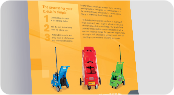 Your guests will love the fun, easy to use vended strollers; you’ll love the hands-free revenue stream with no capital expense. Smarte Wheels strollers are available from a self-service vending machine. Your guests can take advantage of all the benefits of having a fun stroller for children without having to rent from a Guest Services desk. The durable plastic strollers are offered in a variety of bright colors and “nest” snugly in a track so they use a minimum amount of square footage. The Smarte Carte patented vending station accepts credit cards as well as cash and dispenses change. Our hands-free program helps ensure your staff is focused on running the mall while still providing a premier stroller service for your guests. It’s fun, it’s easy, and there is no capital expenditure for you. Use credit card or cash at the vending station. Pull the next stroller in line from the release arm. Watch children smile and enjoy hours of entertainment and comfort in the stroller. The process for your guests is simple Tired of using Operations to maintain strollers? Smarte Carte location managers maintain and service the equipment, providing all parts and repairs free of charge as part of the program. Looking to invest capital in your mall instead of in strollers? Smarte Carte owns and installs the stroller vending equipment and pays you a part of the stroller rental revenue. There is nothing for you to buy and there is no ongoing maintenance fee.