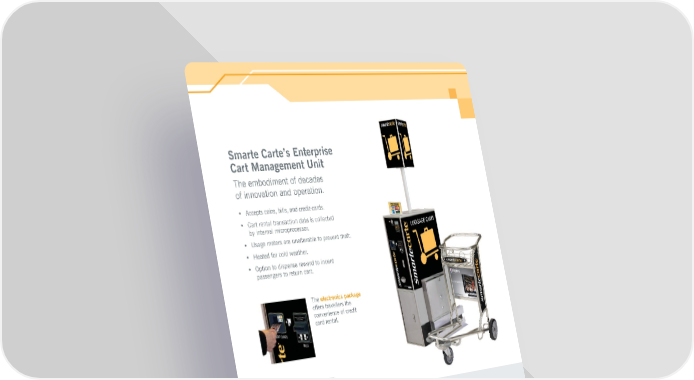 Smarte Carte’s Enterprise Cart Management Unit • Accepts coins, bills, and credit-cards. • Cart rental transaction data is collected by internal microprocessor. • Usage meters are unalterable to prevent theft. • Heated for cold weather. • Option to dispense reward to incent passengers to return cart. The electronics package offers travellers the convenience of credit card rental. Height with sign 93.5" Height of sign 39.5" Width 25' (cart capacity: 31 carts) Minimum Length 15' (cart capacity: 17 cars) Storage sections 5' increments, each section holds 7 carts. Power 120VAC 240VAC or battery operation (USA only) Peak use: 70 watts Stand-by: 17 watts Heater requires 1500 watts Communications Credit card acceptance utilizes telephone line, copper or wireless LAN or stored transaction technology. Cabinet Constructed of high quality steel, with a custom silver powder finish and clear coat. Patents U.S. Patent 7,448,476. U.S. Patent 7,857,108. The embodiment of decades of innovation and operation. CART MANAGEMENT UNIT SPECIFICATIONS